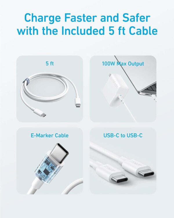 - Lo que obtienes: cargador Anker 317 (100 W), cable USB-C a USB-C de 5 pies / 4.9 ft, guía de bienvenida (idioma español no garantizado).