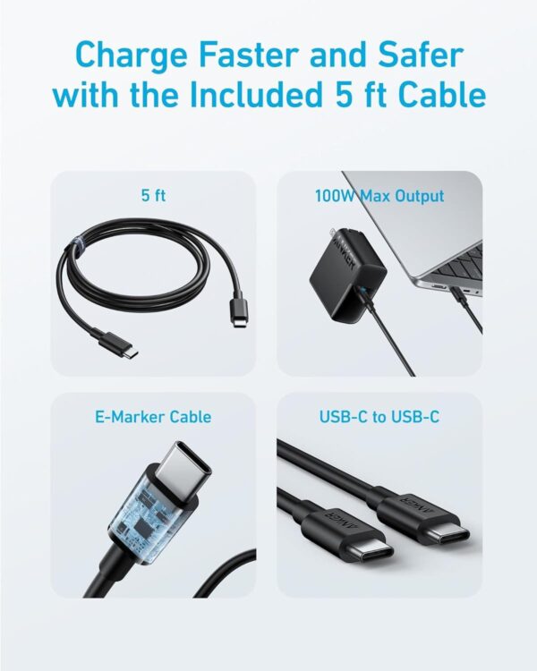 - Lo que obtienes: cargador Anker 317 (100 W), cable USB-C a USB-C de 5 pies / 4.9 ft, guía de bienvenida (idioma español no garantizado).