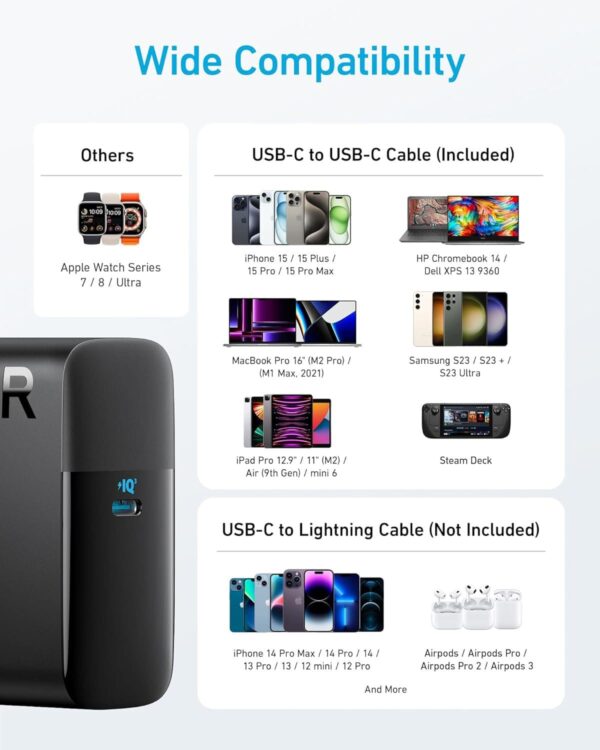 - Amplia compatibilidad: desde teléfonos hasta computadoras portátiles y más, nuestra tecnología patentada PowerIQ 3.0 proporciona una compatibilidad perfecta con prácticamente cualquier dispositivo móvil.