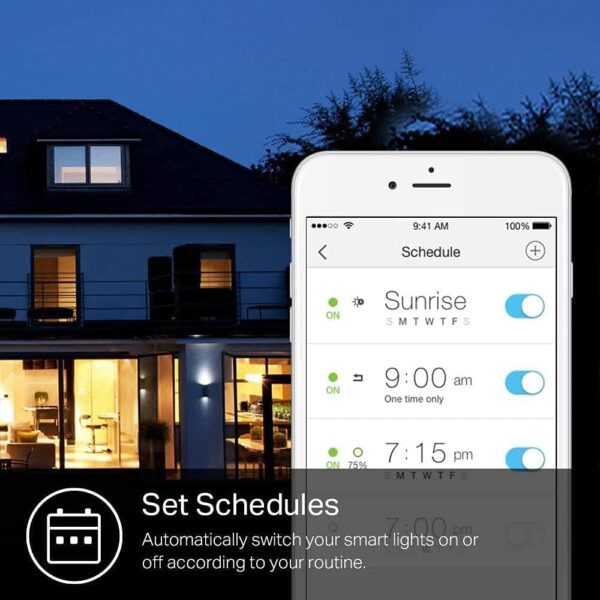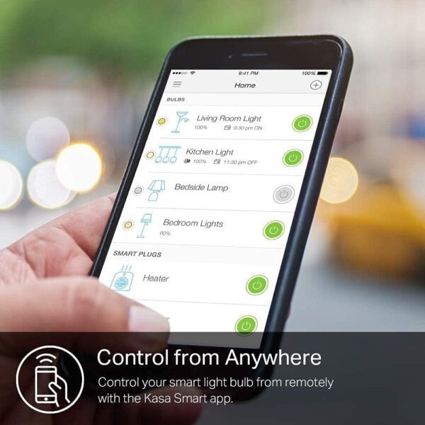 - Control remoto y modo de ausencia: Controla tu bombilla inteligente desde cualquier lugar con tu teléfono utilizando la aplicación inteligente gratuita Kasa (iOS, Android); atenúa, enciende o apaga o cambia los colores de tu bombilla de forma remota al alcance de tu mano. Habilita el “modo de ausencia” para encender y apagar aleatoriamente las luces para engañar a posibles intrusos.